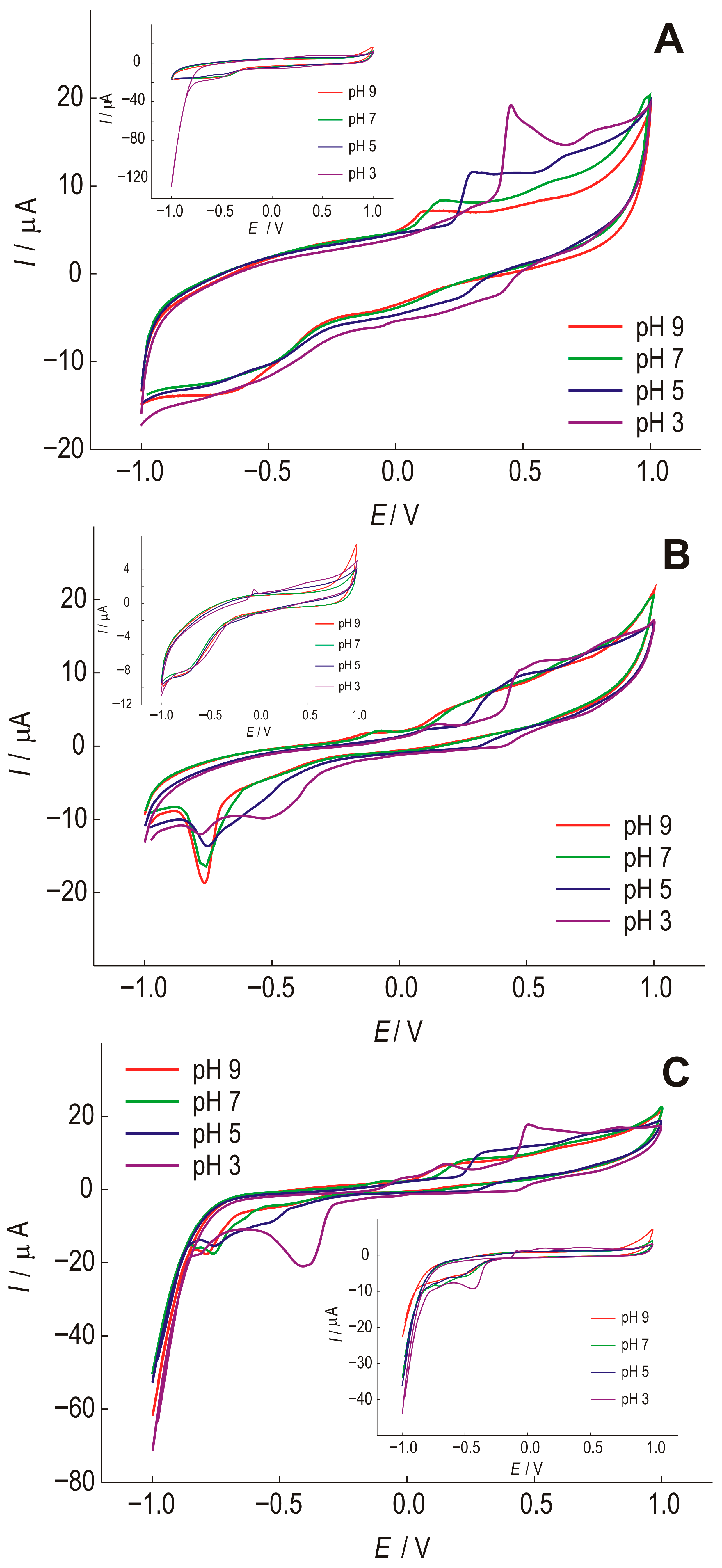 Figure 3B), a series of reactions can be observed that are not seen in the electrode without gallic acid. The SWCNT/Bi electrode also shows that with increasing pH, the current peak of gallic acid oxidation is shifted in the cathodic direction, to 465 mV, 417 mV, 245 mV, and 172 mV. The second stage of gallic acid oxidation becomes visible with decreasing pH value; at pH 3 it is at a value of 831 mV and at pH 5 at a value of 746 mV. The anodic currents are smaller than for the electrode without Bi, and the current peaks are weakly pronounced. The oxidation reactions are most pronounced at pH 3, where the oxidation reaction is followed by a quasi-reversible reduction reaction. At lower pH values, a current peak that could be attributed to the reduction of gallic acid can be observed at a potential of 416 mV for pH 3 and 315 mV for pH 5, but with a much lower intensity compared to the oxidation current peak, indicating a quasi-reversible reaction. At pH above 5, the reduction reaction of gallic acid is not observed, indicating an irreversible reaction. It is certainly important to point out the occurrence of pronounced reduction current peaks for all pH values at a potential of about −750m V. These current peaks are well defined at pH 9 and can be attributed to the reduction of bismuth, which is more pronounced in the presence of gallic acid.