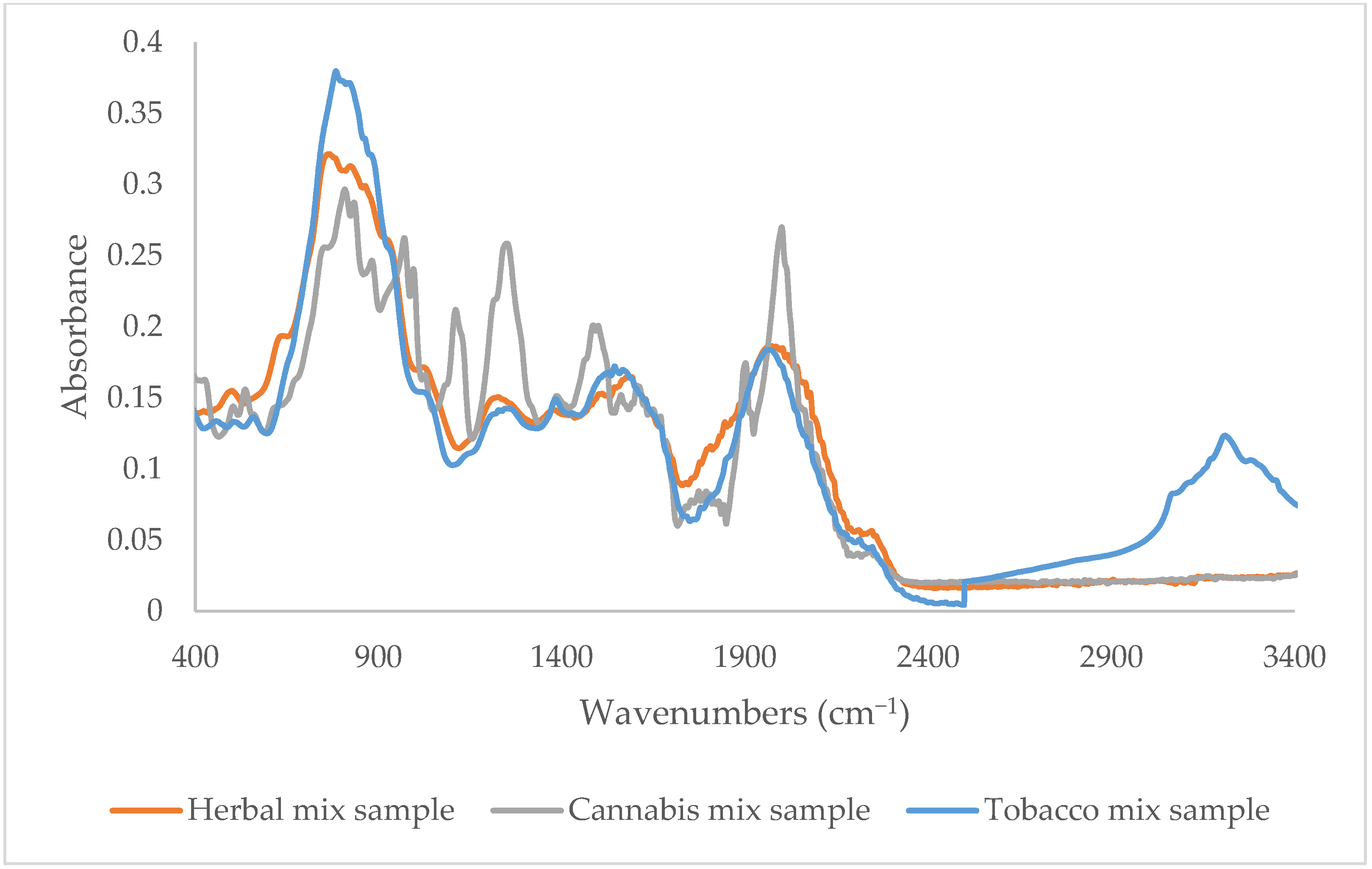 Figure 1 shows the MIR spectra of the cannabis mix sample, the tobacco mix sample, and the herbal mix sample.