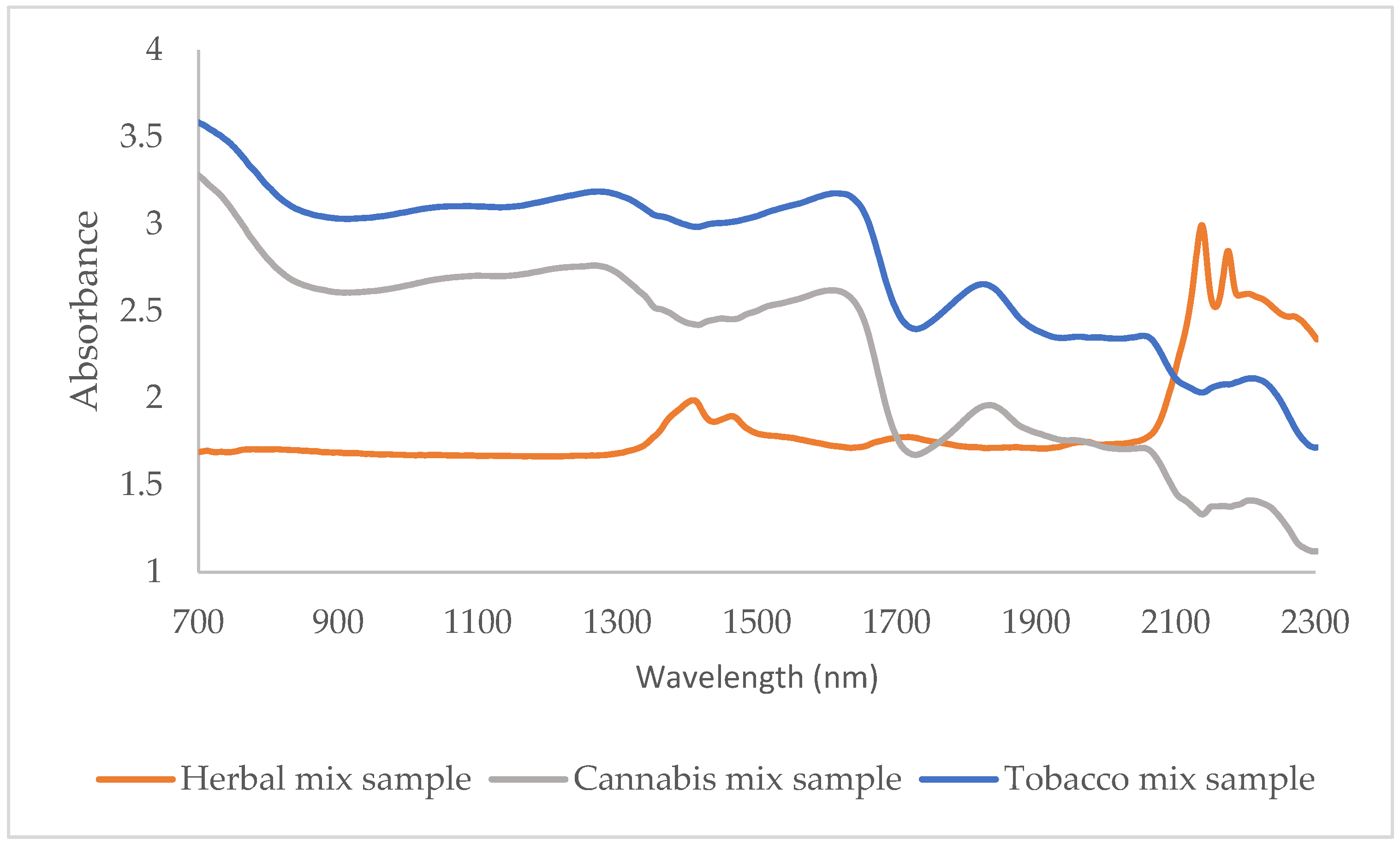 24], and the distinct feature around 1900 nm in the cannabis and tobacco mix samples was attributed to a combination of O–H stretching and bending, likely from water or alcohols [