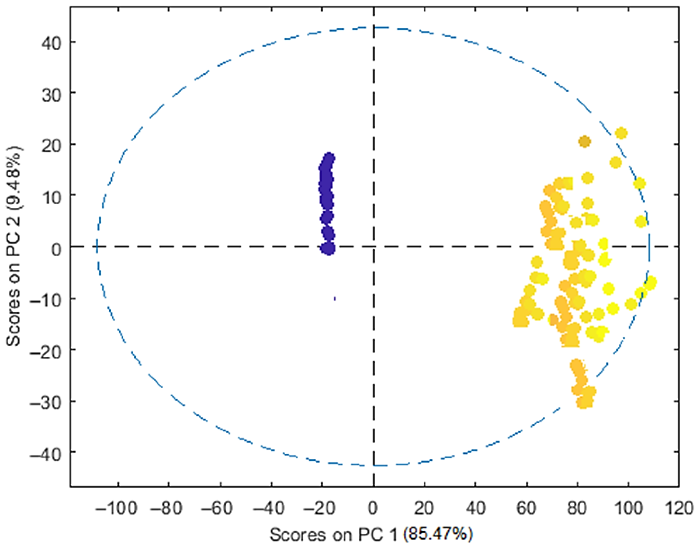 PCA plot obtained with the NIR spectra using the first derivative as preprocessing technique for tobacco detection in herbal smoking products. Yellow dots: spiked samples, blue dots: non-spiked samples, dashed oval represents confidence ellipse.