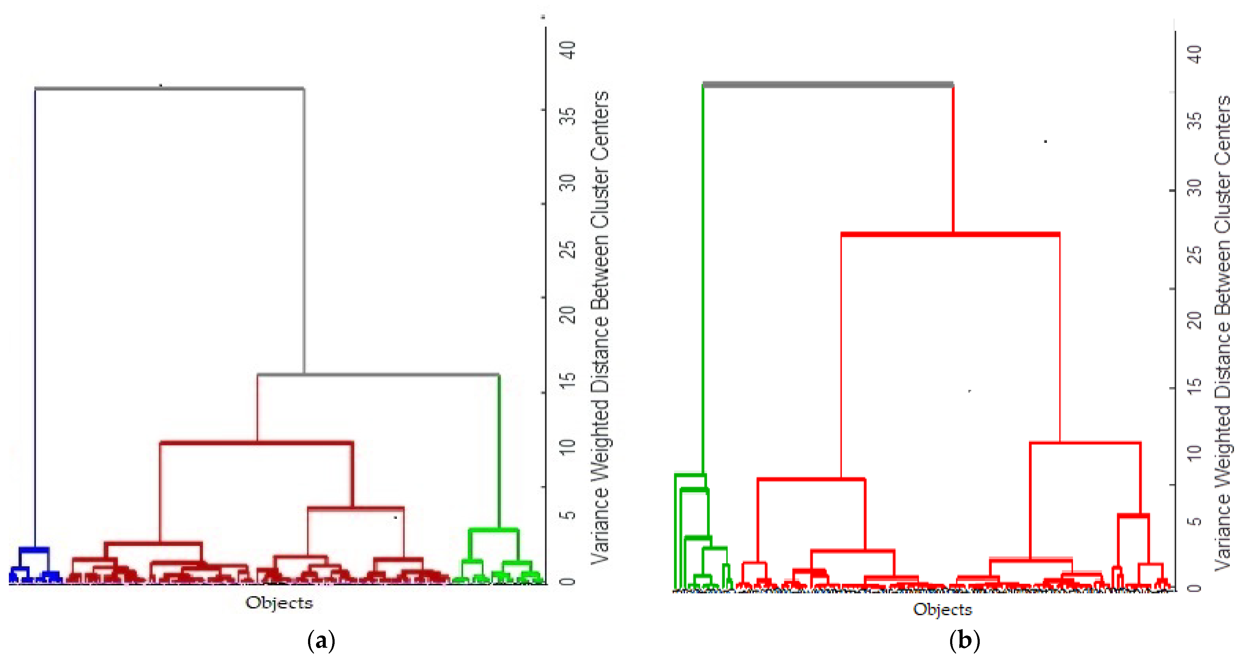 Hierarchical Cluster Analysis (HCA) dendrograms based on (a) MIR data for detecting cannabis in tobacco samples, Blue cluster: samples prepared with the mixture of tobacco samples and spiked with the mixture of cannabis samples, Red cluster: tobacco samples spiked with cannabis, and Green cluster: non-spiked samples; (b) NIR data, Green cluster: non-spiked samples, Red cluster: tobacco samples spiked with cannabis.