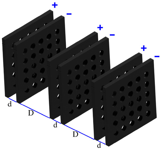 Electrode spacing and alignment were controlled using laser-cut acrylic templates, maintaining a positional tolerance of ± 0.05 mm across the entire array. These parameters were optimized to minimize charge leakage, ensure symmetric potential distribution, and stabilize the electric field during high-frequency operation. Electrodes with opposite polarities are spaced at a distance (d), while electrodes of identical polarity are separated by (D + d) (Figure 1).