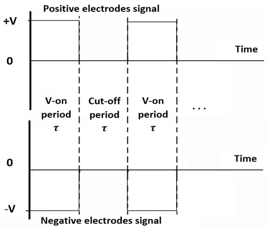 Square-wave voltage signal supplying power to the FRP electrodes. The dashed vertical lines indicate the transition points between the voltage-on and cut-off periods (τ) for both positive and negative electrode signals.