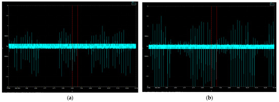 FRP back-end anode voltage relative to background signals. The cyan trace represents the RMS voltage fluctuations (), and the red vertical line indicates the voltage cut-on reference point (τ). (a) Signal profile without thermionic electron emission (baseline noise). (b) Signal profile with thermionic electron emission, showing increased fluctuation amplitude due to active charge transport across the electrode array.