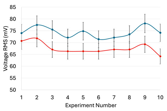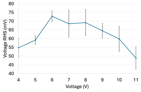 The stability of anode under these optimized conditions (6 V, 600 kHz) was evaluated by recording ten successive measurements at 60 s intervals, beginning 5 min after activating the experimental setup. The results, presented in Figure 8, showed a standard deviation of 1.53 mV, approximately 2% of the average value, indicating high operational stability.