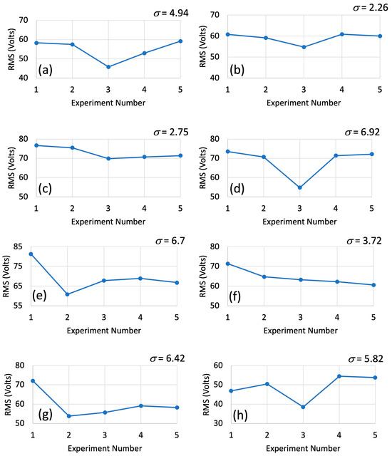 Statistical analysis of experimental results showing the standard deviation (σ) of the measured at constant FRP frequency (500 kHz) for voltages ranging from 4 V to 11 V: (a) 4 V, 500 kHz; (b) 5 V, 500 kHz; (c) 6 V, 500 kHz; (d) 7 V, 500 kHz; (e) 8 V, 500 kHz; (f) 9 V, 500 kHz; (g) 10 V, 500 kHz; (h) 11 V, 500 kHz.