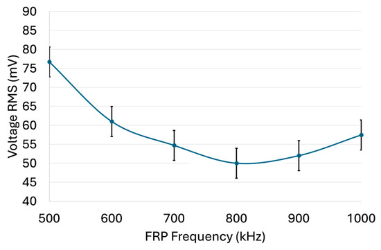 From Figure 5, the optimal FRP voltage was determined to be approximately 6 V. Similarly, Figure 7 indicated that a critical operating frequency of about 600 kHz produced the most distinct ECS variation upon particle introduction. Accordingly, all subsequent detection trials were performed at the optimized operating point of 6 V and 600 kHz, which consistently yielded stable and reproducible signals (σ ≈ 2%).