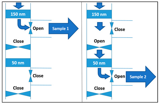 - The first sample is directed from the blender through the 150 nm filter directly to the polarization filter, bypassing the 50 nm filter, thereby maximizing the probability of capturing viral particles.