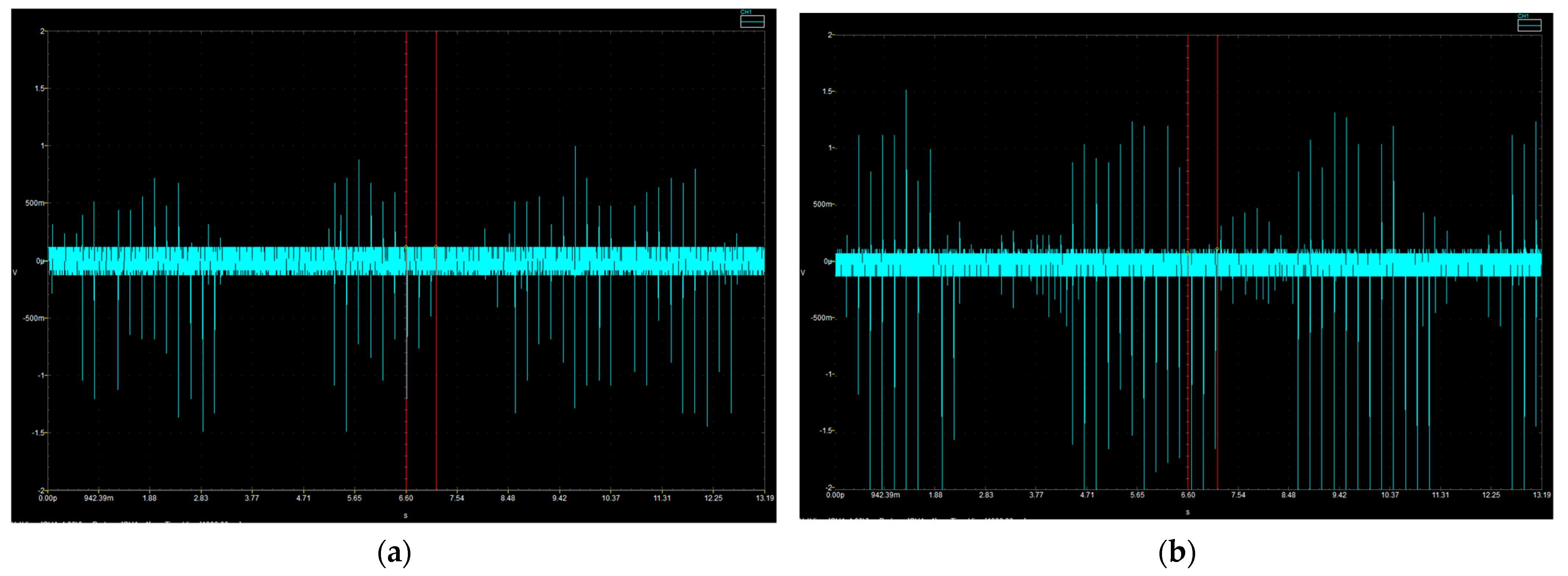 - Case I—Negative test:The subtraction results in a signal fluctuating around zero with no increasing trend over time. This indicates that the two samples are essentially identical, confirming the absence of impurities within the 150–50 nm size range (negative detection).