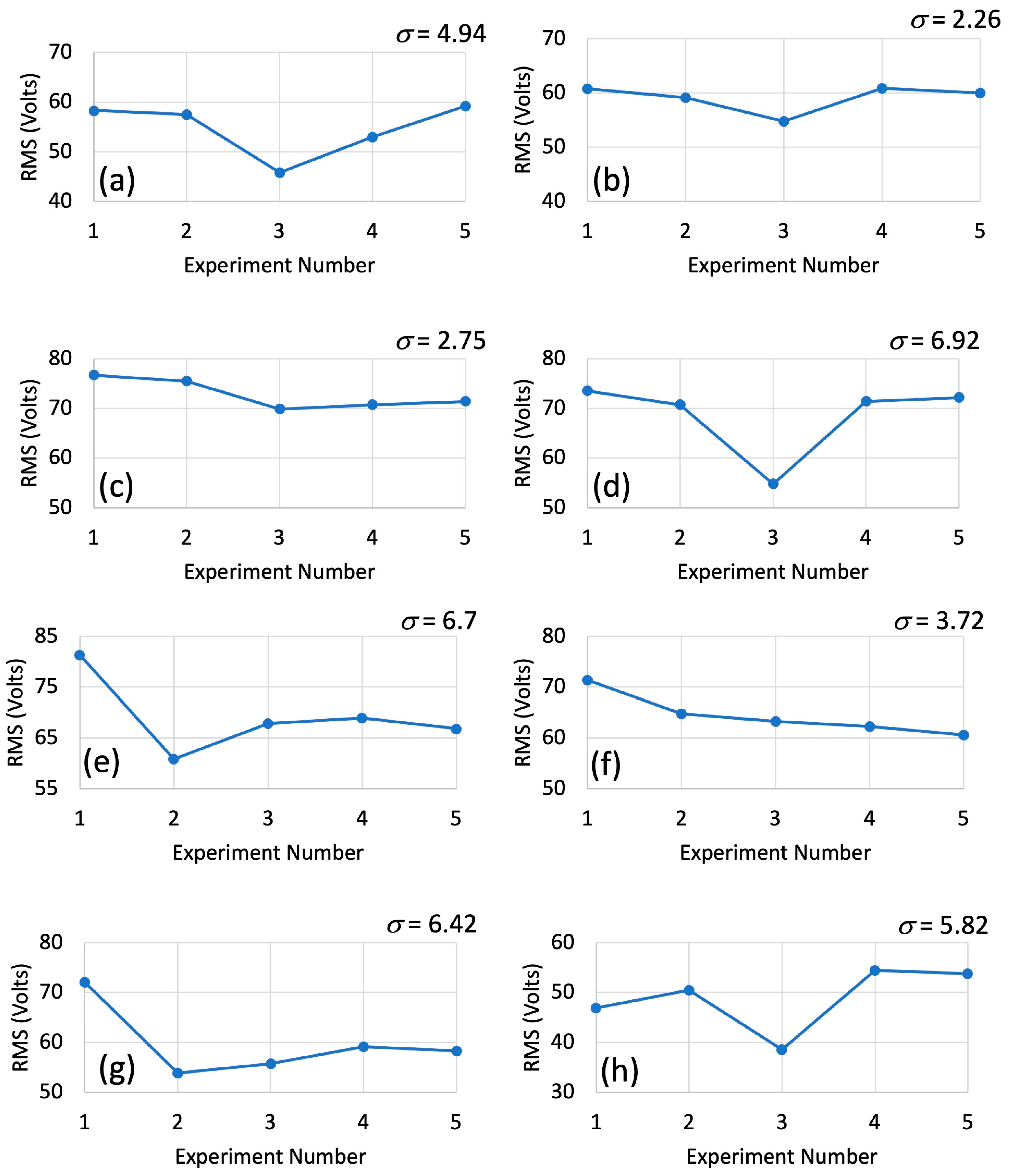 RMS voltage variation | ΔVRMS (mV) | 1.53 mV (≈2%) | — | From 10-cycle stability test |