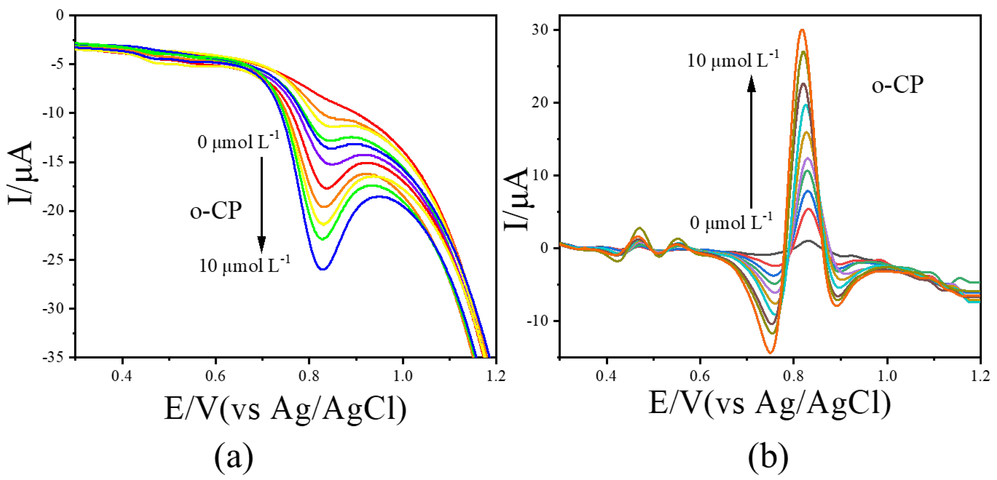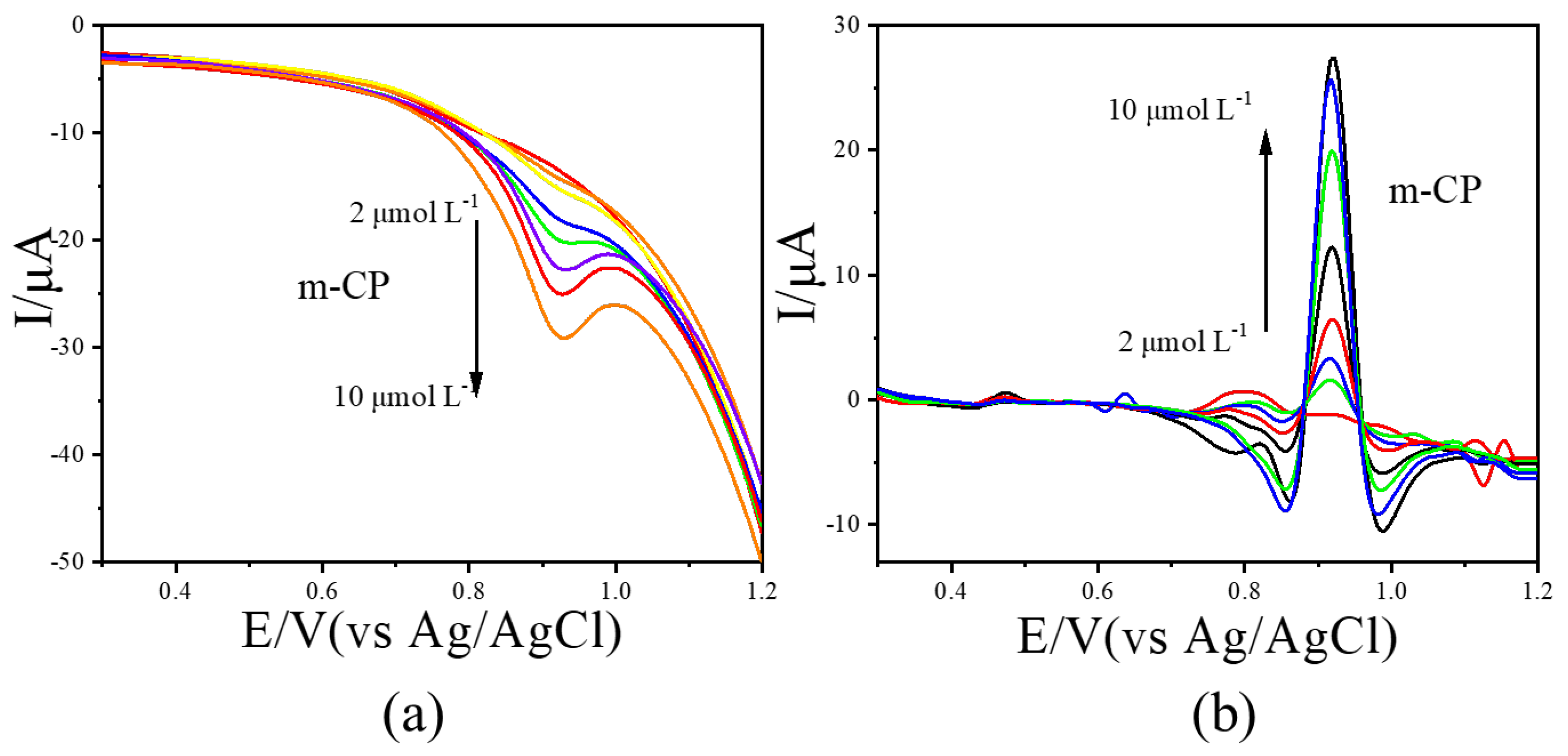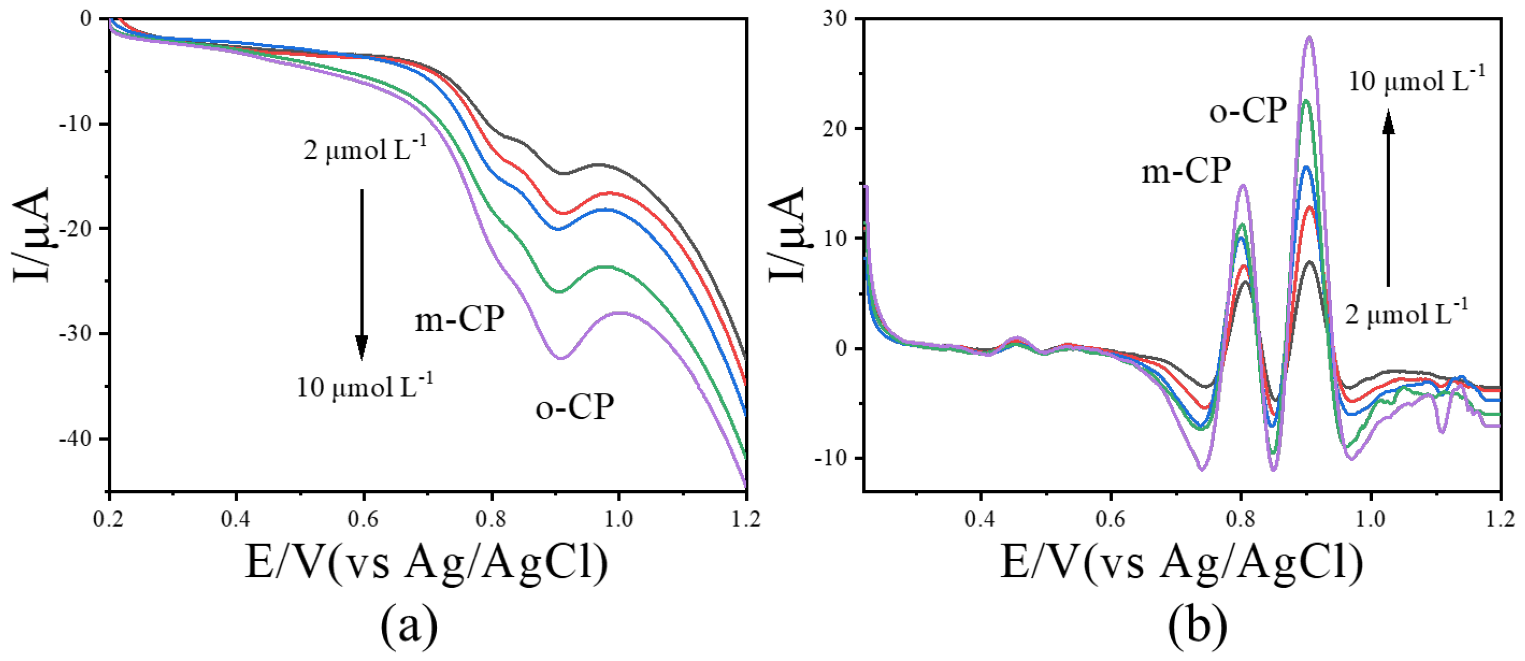| Options | Peak Potential Difference Value (V) | Sensitivity for o-CP (A/mol L−1) | LOD for o-CP (μmol L−1) | Sensitivity for m-CP (A/mol L−1) | LOD for m-CP (μmol L−1) |