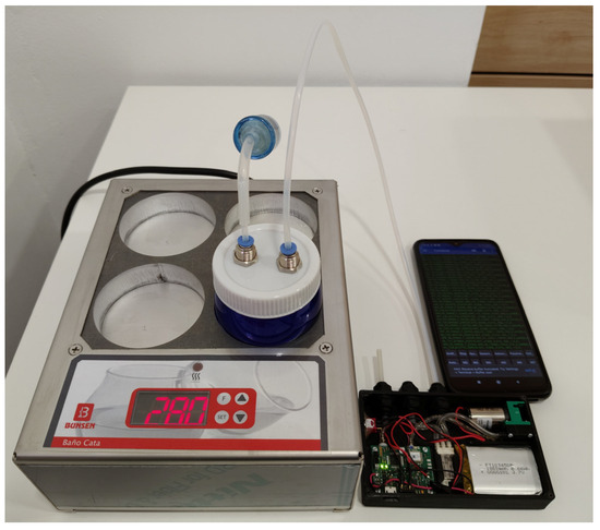 A portable MOS-array EN, shown in Figure 1, was used. It is equipped with an internal pump to draw the headspace from the sealed sample container and a valve that switches between the filtered-air inlet (blank/conditioning) and the sample headspace. Acquisition and control of the measurement cycle (valve switching, exposure, and purge times) are handled via Bluetooth wireless connection to a mobile application. This prototype has previously been used for wine quality control and for monitoring the olfactory evolution of sourdough, as described in earlier studies [12,13]. A schematic of the prototype and its pneumatic flow path is provided in the Supplementary Materials (File S3).