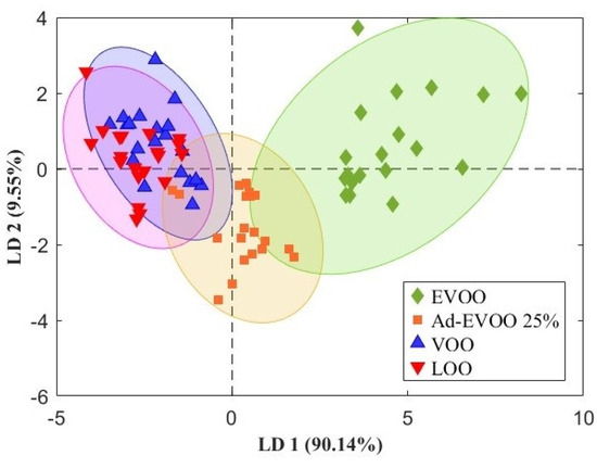 Figure 2 shows the LDA projection (LD1 = 90.14%; LD2 = 9.55%). The raw e-nose time-series used for the multiclass (EVOO/VOO/LOO/Ad-EVOO) task are available in the Supplementary Materials (File S2).
