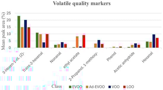 Volatiles (CAS, TR, odour descriptor) and mean ± SD per class for n = 3 (EVOO, Ad-EVOO, VOO, and LOO). Different lowercase letters indicate significant differences for each volatile across classes (Tukey’s test, p < 0.05).