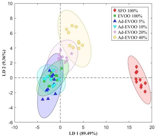 The LV1 axis acts as an SFO gradient: the 100% EVOO cluster concentrates at LV1 < 0 with LD2 near 0, whereas 100% SFO is strongly shifted to LD1 ≫ 0 (≈15–19) with LD2 close to 0, with no overlap with EVOO. Low adulteration levels (Ad-EVOO 5–10%) lie adjacent to the EVOO cluster in the negative LD1 half-plane (LV2 ≈ −1 to 1). From 20% Ad-EVOO onwards, the set forms an intermediate band that crosses LD1 ≈ 0 and rises in LD2 (≈2–3.5), already showing clear separation from EVOO. At 40% Ad-EVOO, the cluster sits in the upper-right quadrant (LD1 ≈ 3–6; high LD2, ≈4–7), well differentiated from both extremes. Overall, the centroids trace a monotonic trajectory—from negative LD1 (EVOO) to highly positive LD1 (SFO)—with a progressive increase in LD2 up to ≈40% SFO and a subsequent decrease in pure SFO; this suggests that LD1 encodes the baseline difference between matrices (EVOO↔SFO), while LD2 captures mixture effects. Operationally, the plot delineates a detection threshold of ≈20% SFO, consistent with reports for portable ENs in oil adulteration and with recent reviews on practical detection limits in EVOO–SFO blends [22,27].