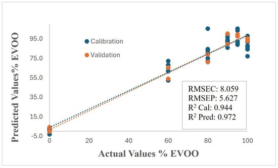 For regression on set (ii) (Ad-EVOO series), PLS was used with an 80/20 split for training/external validation stratified by blend level. We report R2cal, R2pred, RMSEC, and RMSEP; selection of the number of latent variables (LVs) followed good chemometric practice [18,19,20].