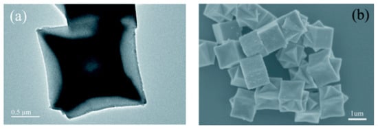 (a) TEM and (b) SEM image of ZnO/ZnFe2O4 hierarchical hollow cubes (reproduced from [] Under a Creative Commons license, Copyright 2017, RSC).