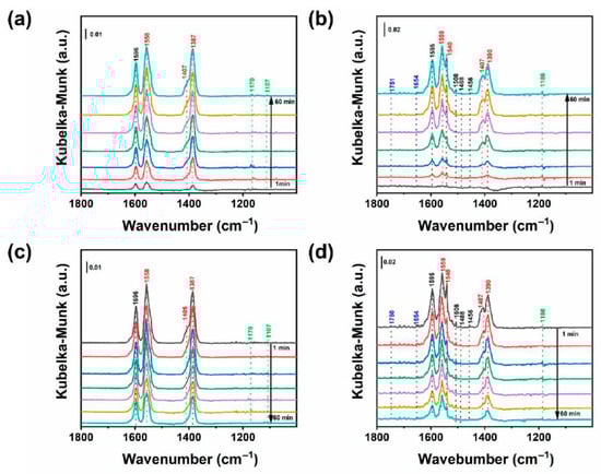 DRIFTS spectra of toluene adsorption (a,b) and oxidation (c,d) on δ-MnO2 and Co−Fe-δ-MnO2-20% at 230 °C, respectively (reproduced from []; Copyright 2022, American Chemical Society).