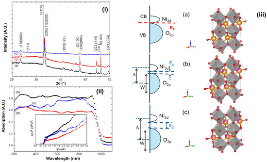 UV–vis spectroscopy measurements show how replacing Nd3+ with Eu3+ affects the electronic structure of these films (Figure 1ii). As mentioned, decreasing the radius of the element replacing Nd in perovskite compounds can significantly affect the electronic structure of nickelate materials, since this substitution can cause rotations, twists, and distortions of the NiO6 octahedra that comprise the crystal lattice. The absorption range from 700 to 1200 nm corresponds to excitation from the occupied to the unoccupied state of the transition metal Ni eg* antibonding orbital. Below 700 nm, absorption results from transitions from the hybridized t2g*/2p oxygen orbitals to the eg* orbitals [31,32].