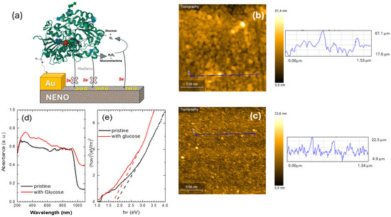 (a) Schematic representation of the enzymatic NENO sensor configuration. The GOx (3QVR structure available in the Protein Data Bank) chain is represented by a green cartoon, and the cofactor FAD is represented by a spacefill model colored by atom element. The protein structure is bound to the gold surface by the adduct cysteamine. Electron transfer (2e−) from the enzymatic reaction to NENO is facilitated by hydrogen peroxide produced through the reoxidation of FADH2 by molecular oxygen, characterizing a first-generation sensor (1stG). The sensor components are represented out of scale for clarity. (b) AFM scans of the pristine and (c) GOx-modified gold electrode deposited on the NENO35 film. The blue lines represent the line scan showing the surface height variation on the NENO30 sample. (d) UV–vis spectra, and (e) estimated Tauc graph of samples for NENO30/Au/CysAm film decorated with GOx before (pristine) and after deposition of a 0.5 M glucose solution on the surface. The dashed red and black lines indicate changes in the absorption slopes.