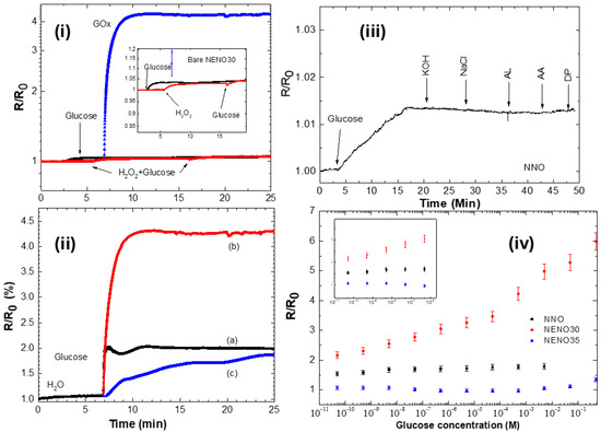 (i) R/R0 versus time curves of pristine and GOx-modified NENO30 film with 20 μL of 0.5 M glucose solution and 0.5 M hydrogen peroxide. The inset shows the rise in the R/R0 with the addition of glucose (black curve) and H2O2 (red curve), and subsequently glucose. (ii) Time resistance of (a) NNO (black), (b) NENO30 (red), and (c) NENO35 (blue) devices, decorated with GOx enzymes, with 20 μL of 0.5 M glucose added to the surface. (iii) Response of the sensor to the addition of 0.5 M glucose and successive addition of KOH, NaCl, Lactic acid (AL), Ascorbic acid (AA), and dopamine (DP). (iv) Calibration curves of R/R0 response to changing glucose concentrations. In detail, the inset shows a magnification of R/R0 at low glucose concentrations for the NNO-Gox and NENO35-GOx devices (noise level < 5%).