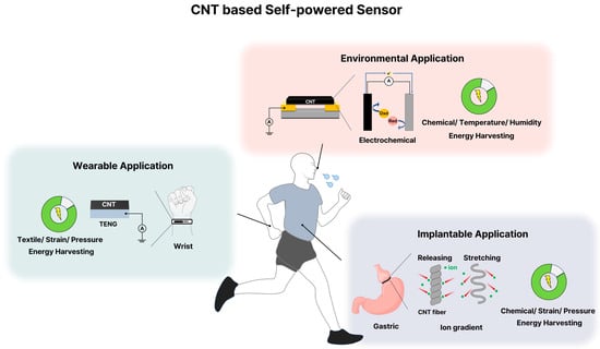 The increasing demand for continuous and real-time monitoring in healthcare, environmental sensing, and wearable devices has intensified the need for autonomous low-maintenance sensors. However, conventional battery-powered sensors are often limited by their dependence on replaceable batteries or wired supplies, the need for frequent maintenance (e.g., battery replacement and calibration), and system-level integration issues, which hinder scalability and long-term usability. Self-powered sensors can harvest ambient energy through piezoelectric, triboelectric, thermoelectric, photoelectric, and emerging electrochemical mechanisms. These include faradaic systems such as redox-type biofuel cells and non-faradaic systems where electric double-layer modulation drives current generation, offering a promising solution to current limitations [1,2]. Among various materials, carbon nanotubes (CNTs) are particularly attractive owing to their high electrical conductivity, mechanical flexibility, high aspect ratio, and tunable surface chemistry. Beyond these general features, CNTs offer unique practical advantages over graphene and MXenes. First, continuous CNT fibers and yarns can be directly spun via floating-catalyst CVD, enabling scalable production of textile-grade conductors, whereas graphene and MXene fibers largely rely on wet-spinning of colloidal inks, often requiring binders or post-treatments [3,4,5]. Second, CNT networks exhibit superior long-term stability under humid and physiological conditions, while MXenes such as Ti3C2Tx are chemically prone to oxidation and graphene fibers require additional functionalization for stability [6,7,8]. These unique characteristics enable CNTs to act not only as conductive materials but also as active sensing elements and energy harvesters, making them highly adaptable to diverse operational demands. Rather than following the traditional classification by working principles, this review organizes recent progress according to application domains (environmental, wearable, and implantable systems), because each context imposes distinct requirements on device design, stability, flexibility, and biocompatibility (Figure 1). By focusing on application-driven scenarios, it reveals how CNT-based platforms are advancing the field of autonomous sensing for biomedical and environmental monitoring.