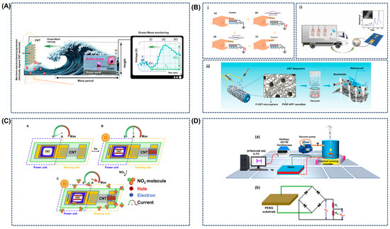 Environmental applications of CNT-based self-powered sensor. (A) Images for electrochemical based sensors. Schematic illustration of the electrical generation principle of the mechano-electrochemical generator. When waves triggered alterations in the electrode-electrolyte interface, the generator’s potential difference was induced accordingly. (Reproduced with permission from Sim et al. [26], ADVANCED SCIENCE, John Wiley and Sons, 2025.) (B) Images for triboelectric based sensors. (i) Demonstrating the open-circuit voltage and short-circuit current of the TENGs at room temperature and humidity. (Reproduced with permission from Vafaiee et al. [29], Scientific reports, Springer Nature Limited, 2023.) (ii) A self-powered wireless sensing system was fabricated, based on a composite of PANI and PDA functionalized CNT. The sensor based on PDA-CNT-PANI exhibited superb sensing performance to NH3, making it a promising candidate of real-time monitoring application. (Reproduced with permission from Wang et al. [30], Sensors and Actuators B: Chemical, Elsevier, 2022.) (iii) Fabrication and properties of PHFC film. (Reproduced with permission from Lan et al. [31], ACS Nano, American Chemical Society, 2021.) (C) Image for photoelectric based sensor, schematic showing the working mechanism of the self-powered flexible sensing system. When illumination is started, a built-in electric field is formed at the interface of the SWCNT/silicon heterojunction, making a closed circuit of the whole system and powering the sensing unit. Finally, in the third stage, the current of the system increases upon exposure to NO2. (A) Original dark stage, (B) Stage under illumination, (C) Exposure to NO2 (Reproduced with permission from Guo et al. [32], Cell Reports Physical Science, Elsevier, 2022.) (D) Image for piezoelectric based sensor. (a) The schematic representation of the experimental setup for the self-powered fluoride detection using BCP-4 as the piezoelectric substrate, (b) Circuit diagram of the voltage divider-based fluoride detecting device (Reproduced with permission from Bhaduri et al. [33], ACS Applied Nano Material, American Chemical Society, 2023.)