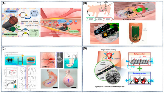 Implantable CNT-based self-powered sensors for biomedical applications. (A) Schematic of a smart stent with cytochrome c/carbon nanotube (Cyt.c/CNT) yarn electrodes designed for real-time vascular monitoring of reactive oxygen species (ROS, H2O2) and continuous power generation via an enzymatic biofuel cell. (Reproduced with permission from Park et al., Journal of Power Sources; published by Elsevier, 2024 [74].) (B) Design and operation of a biofuel cell (BFC)-driven capsule sensor in a porcine model targeting glucose, equipped with pH-resistant protection, microchip, and loop antenna, harvesting energy from glucose oxidation through redox mediators. (Reproduced from De la Paz et al., Nature Communications; published by Springer Nature, 2022 [75].) (C) Mechano-electrochemically driven (MECH) fiber harvesting energy from mechanical deformation for organ monitoring, demonstrated in pig stomach and bladder models without structural damage. In vivo, the fiber was wound around the pig stomach to read surface strain during fluid-driven contraction and expansion; blue arrows indicate (top-left) the needle-tied anchoring on the gastric wall and (bottom-left/right) the contracted (deflated) and expanded (inflated) stomach states, re-spectively. (Reproduced with permission from Sim, H.J. et al., Nano Letters; published by the American Chemical Society, 2022 [76].) (D) Structure and working principle of the synergistic coiled–buckled fiber (SCBF) for organ motion tracking, generating power from buckle unfolding and coil opening during strain, designed for monitoring dynamic organ movements. (Reproduced with permission from Sim, H.J. et al., Nano Energy; published by Elsevier, 2024 [77]).