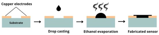 The ethanol/carbon nanomaterial mixtures after ultrasonication were deposited using the drop-casting technique onto preliminary heated (80 °C) textolite substrates (1.5 × 1.5 cm) with pre-patterned copper electrodes (1.5 × 0.5 cm). The area of carbon deposition on the substrate was 1 × 1 cm (Figure 1).The carbon film was above the electrodes.