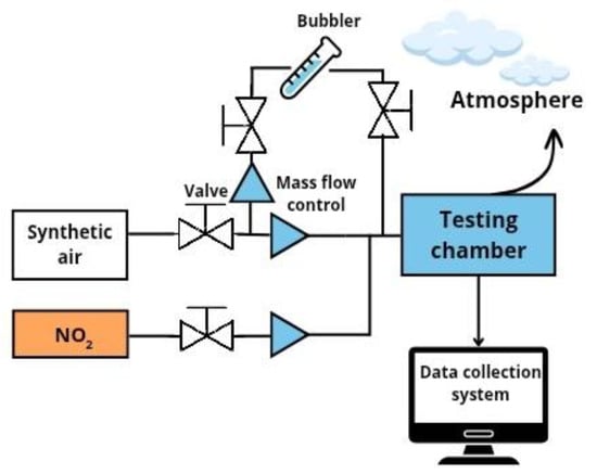 The fabricated sensors were tested using a two-point measurement technique (Keithley 2401 Source Meter, Solon, OH, USA) placed in a gas cell in a special setup (dynamic type) with data acquisition performed through LabVIEW 2021 software. The experimental setup scheme is shown in Figure 2.