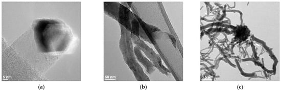 The average diameter of the CNFs was 44.9 ± 5.5 nm, which is significantly higher compared to SWCNTs. The length of the CNFs reached several microns. The Ni-catalyst nanoparticles are also shown in Figure 3a, where the fishbone structure is clearly visible. The CNFs are strongly entangled, as the catalytic nanoparticles moved and changed shape during their growth, caused by the formation of dense structures (Figure 3c). It is known that using a Ni-containing catalyst usually produces carbon nanofibers with a fishbone structure due to the shape of the catalyst []. The TEM images of TuballTM SWCNTs are presented in [,].