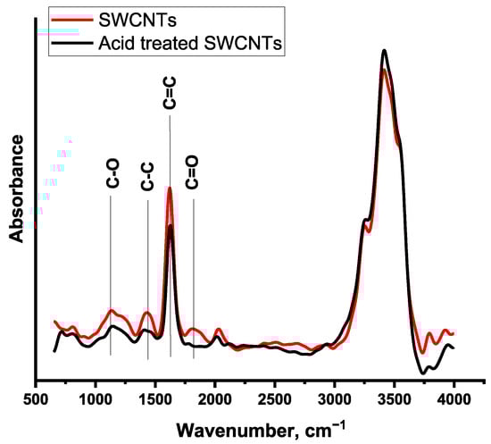 In the early stages of the study, it was found that the use of unmodified SWCNTs in suspension preparation did not lead to the expected result of homogeneous dispersion, which prevented the ability to obtain a high-quality film on the sensor using the drop-casting technique. The most appropriate solution was to use chemical treatment of SWCNTs to increase the oxygen content of the functional groups on their surface, enhancing their hydrophilicity for better dispersion in ethanol. It can be noted that CNFs require no treatment and meet the requirements for obtaining the sensor film. FTIR spectra of untreated and treated samples of SWCNTs are shown below (Figure 4).
