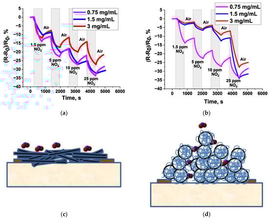 The highest response is observed for the sensor made from a suspension of SWCNTs in ethanol at 0.75 mg/mL (excluding concentrations below 5 ppm), as well as for CNFs at the same concentration of 0.75 mg/mL. The absolute values of the sensor response for CNF-based films strongly decrease when the concentration exceeds 0.75 mg/mL. This is mainly attributed to the increased roughness of the film at lower suspension concentrations. Conversely, increasing the concentration causes blocking of the inner layers of the coating. This phenomenon is mainly related to the porous nature of the CNF film, which allows adsorption not only on the surface layers (typical for SWCNTs; Figure 6c) but also within the internal structure when in contact with NO2 (Figure 6d).