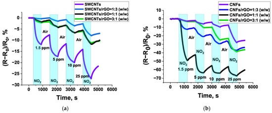 The addition of rGO causes the decrease in sensor response (Figure 8a). The sensor response is also influenced by the component content in the composite. Experimental data show that the composite based on CNFs and rGO exhibits a better response than the sensor based on pure CNFs. Namely, the hybrid material based on CNFs and rGO in a ratio 1:1 showed the extremely high response reaching 49% at 1.5 ppm, which is high enough for all carbon composites. The decrease in rGO concentration below 50 wt.% and above it induced the decrease in ΔR/R0.