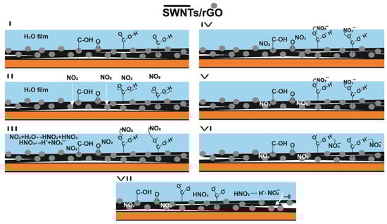 Consequently, given that the constituents of the SWCNTs/rGO composite possess a highly hydrophilic surface due to an abundance of functional groups, e.g., carboxyl groups on the SWCNT’s surface and epoxy/hydroxyl groups on the rGO’s surface, and considering the sensor’s surface morphology is characterized by a dense network of SWCNTs interspersed with rGO particles, it can be postulated that the thickness of liquid film varies with the humidity level supplied to the samples. Let us examine this mechanism using 25% relative humidity as an example. The mechanism of NO2 interaction under humid air with carbon–carbon composites is shown in Figure 10.