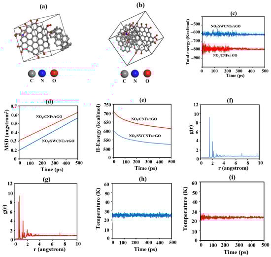 Molecular dynamics simulations were performed to investigate the interaction of NO2 molecules with CNFs/rGO and SWCNTs/rGO complexes. The initial structures of CNFs, SWCNTs, and rGO were constructed using Material Studio 2019, and NO2 molecules were positioned near the surface to allow adsorption studies. The simulations were carried out using the Forcite module with the COMPASS force field to accurately describe intermolecular interactions [,]. A cubic simulation cell was employed, and the systems were equilibrated under the NVT ensemble using the Nose–Hoover thermostat. The total simulation time was set to 500 ps with a time step of 1 fs, and trajectories were collected for analysis. The energy fluctuation curve showed that the system stabilized after ~300 ps, with minimal further changes, indicating that full adsorption equilibrium was achieved and adequately sampled within the simulation time. Various analyses such as energy fluctuation curves, mean square displacement (MSD), radial distribution function (RDF), and temperature fluctuations were calculated to evaluate adsorption behavior and stability.