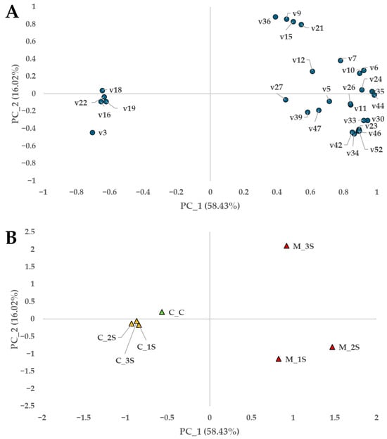 The first principal component (PC1), accounting for 58.43% of the total variance, effectively discriminated control samples across storage stages (C_1S, C_2S, and C_3S) from those inoculated with Monilinia, with the former and latter distributed along the negative and positive axes of PC1, respectively (Figure 2B). Volatile compounds such as ethyl acetate (v3), methyl (Z)-N-hydroxybenzenecarboximidate (v22), 4-methylactane (v19), ethylbenzene (v18) and 2,4-dimethylheptane (v16) were predominantly associated with control batches, suggesting their potential as markers of unaltered fruit. In fact, lactones have been associated with the intense aroma of various peach cultivars [30,34]. In addition, peaches infected with M. fructicola exhibit significantly lower concentrations of these compounds, as well as reduced levels of hydrocarbons [31].