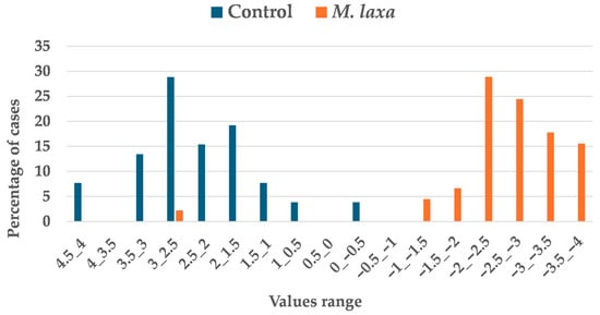 To obtain a representative value for each measurement cycle, a baseline manipulation algorithm was implemented. This characteristic value was calculated as the proportional difference between a reference value (Vref) and the value recorded during exposure to volatile compounds (Vodor). The reference value (Vref) was defined as the average of the last five readings taken during the sensor’s exposure to the air phase. On the other hand, the value of the volatiles (Vodor) was defined as the average of the last five readings recorded during the sensor’s exposure to the headspace of the sample. The final value (Vf) was calculated using the following expression: