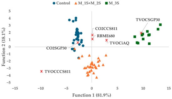 Table 3 summarizes the outcomes of the LDA, demonstrating its efficacy in differentiating healthy nectarines from those exhibiting fungal decay. The table prioritizes the most influential E-nose sensors, ordered by their significance as determined by the step-by-step selection algorithm utilized in this study. It also provides the number and percentage of correct classifications achieved during both calibration and prediction phases, offering a comprehensive evaluation of the model’s performance. Specifically, the CO2CCS811, ResohmCCS811, RBME680, and EtanolSGP30 sensors collectively achieved a 97% correct classification rate in discriminating between healthy and M. laxa-infected nectarines (Table 3; Figure 3).