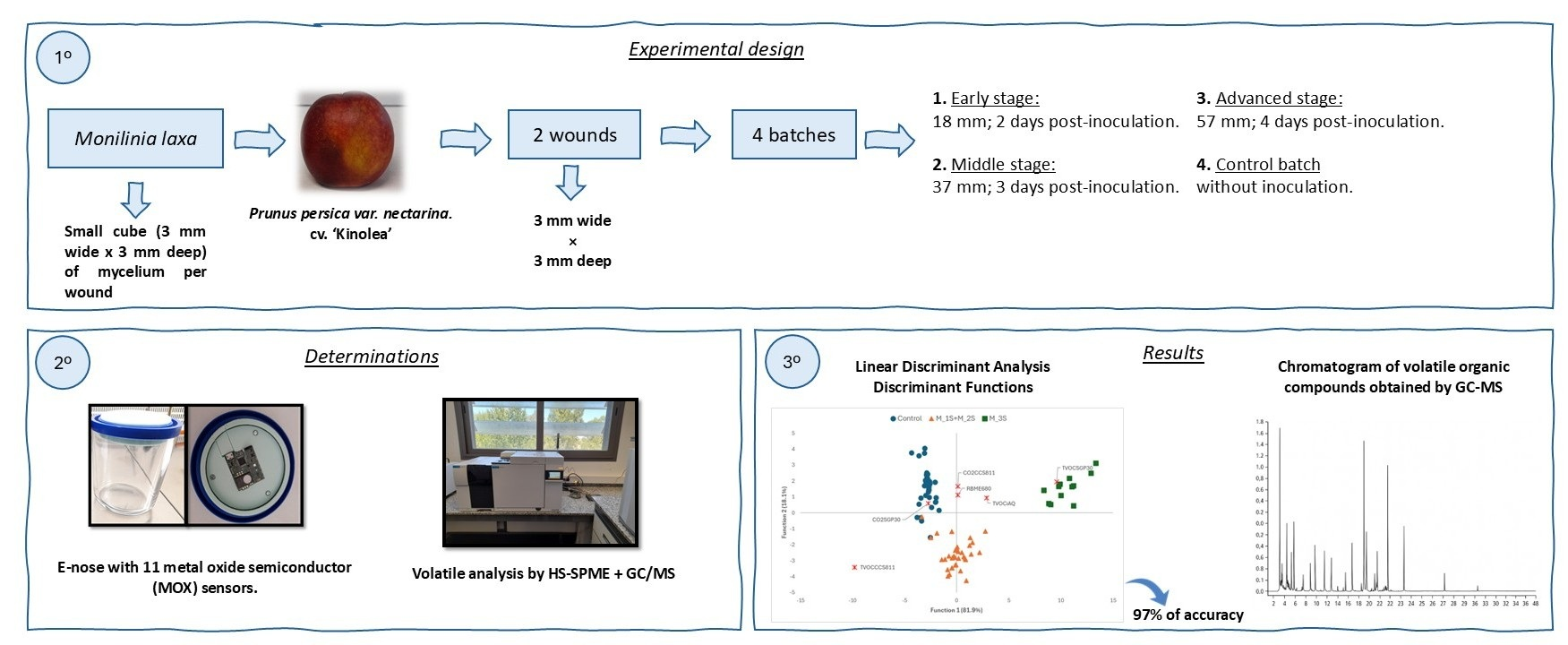 Post-inoculation, fruits were individually placed in transparent polyethylene containers (25 × 25 × 11 cm; width × height × depth) and incubated at 25 °C. Volatile organic compound (VOC) analysis was conducted using gas chromatography coupled with mass spectrometry (GC-MS) and an electronic nose (E-nose). Three stages of infection were defined according to lesion diameter (stage factor): (i) early (18 mm, 2 days after inoculation), (ii) middle (37 mm, 3 days) and (iii) advanced (57 mm, 4 days). Each stage was considered as an independent batch, and each was associated with its corresponding control (healthy, non-inoculated nectarines stored under the same conditions). For each batch, three biological samples per treatment were used to ensure the reproducibility of the results.