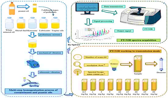 Workflow of FT-NIR spectroscopy for detecting contaminants in edible oils. The process involves homogenization of oil samples with potential pollutants, followed by FT-NIR spectral acquisition in transmission mode. This integrated pipeline highlights the role of FT-NIR combined with advanced machine learning models in ensuring food safety and quality control. Reused with permission from [].