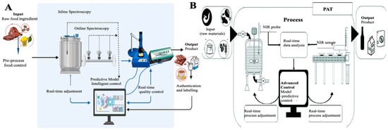 Schematic representation of portable and online near-infrared (NIR) spectroscopy systems used for food quality monitoring. (A) Portable NIR devices are used for real-time, non-destructive analysis of raw ingredients and processed food, enabling quality control and decision-making through predictive modeling. Adapted with permission from []. (B) Inline NIR probes integrated into the processing line continuously collect spectral data for real-time analysis and adjustment, forming part of process analytical technology (PAT) systems to ensure consistent product quality during manufacturing. Reused with permission from [].