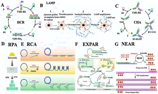 Biosensors are integrated analytical devices that combine a biological recognition element with a physicochemical transducer to detect specific analytes with high sensitivity and specificity. Their application in food systems has expanded rapidly, driven by the demand for real-time, minimally invasive, and decentralized tools to safeguard quality and safety. The biological recognition element, commonly enzymes, antibodies, nucleic acids, aptamers, or whole cells, confers selectivity by binding to the target analyte, thereby initiating a biochemical interaction. This event is then converted by a transducer into a measurable signal. Biosensors have emerged as portable, sensitive, and low-cost tools for food safety monitoring. Figure 3 summarizes the major nucleic acid amplification techniques integrated into biosensing systems for food safety applications. Figure 3A–C show enzyme-free amplification methods such as Hybridization Chain Reaction (HCR) and Catalytic Hairpin Assembly (CHA), which rely on the self-assembly of DNA hairpins for signal enhancement. These isothermal reactions amplify nucleic acid targets without enzymes, improving stability and suitability for on-site food pathogen detection []. Loop-Mediated Isothermal Amplification (LAMP), shown in Figure 3B, uses multiple primers and a strand-displacing polymerase to rapidly amplify DNA sequences under constant temperature, enabling visual detection through color or fluorescence signals []. Figure 3D,E [,] show Salmonella or E. coli screening in food samples, while Rolling Circle Amplification (RCA) provides continuous amplification from circular templates, producing long single-stranded DNA with high sensitivity. Figure 3F,G demonstrates Exponential Amplification Reaction (EXPAR) and Nicking Enzyme Amplification Reaction (NEAR), both of which achieve ultra-fast amplification by recycling short DNA fragments through nicking and polymerase activity [,]. These methods enable near real-time detection and are increasingly coupled with colorimetric or electrochemical biosensors for food pathogen monitoring. These approaches enable rapid signal amls can enhance both recognition and signal transduction. For example, Gao et al. [] reported the use of magnetic nanomaterials with dual-recognition strategies to improve sensitivity and enable multiplex detection of foodborne bacteria, while Li et al. [] developed a DNA tetrahedral scaffold-based electrochemical biosensor for simultaneous detection of aflatoxin B1 and ochratoxin A, illustrating the potential of nucleic acid nanostructures for multi-analyte sensing.
