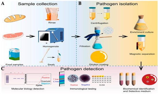 Workflow for foodborne pathogen detection, showing (A) sample collection from food matrices (bread, meat, milk) via rinsing, swabbing, or homogenization; (B) pathogen isolation through centrifugation, filtration, enrichment, and magnetic separation; and (C) detection using molecular assays (PCR), immunological tests (lateral flow, ELISA), and biochemical identification on selective media. Reused with permission from [].