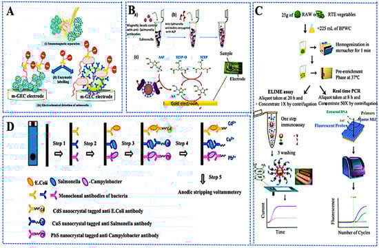 Advanced hybrid biosensing strategies for pathogen and contaminant detection. (A,B) Immunomagnetic separation combined with electrochemical detection of Salmonella. Reused with permission from [,] (C) Comparative workflow of ELIME assay versus real-time PCR for fresh produce analysis. Reused with permission from [] (D) Multiplex immunosensor integrating nanocrystal-labeled antibodies for simultaneous detection of foodborne pathogens (E. coli, Salmonella, Campylobacter) and heavy metals. Reused with permission from [].
