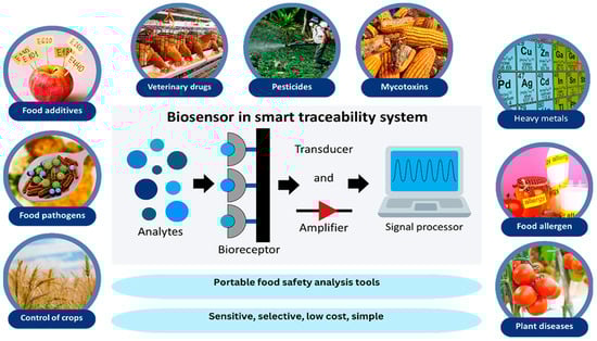 Biosensors in smart traceability systems for food safety. Applications include the detection of food additives, veterinary drugs, pesticides, mycotoxins, heavy metals, allergens, foodborne pathogens, and plant diseases. The biosensor framework involves analyte recognition via bioreceptors, signal transduction, amplification, and data processing to deliver portable, sensitive, selective, and cost-effective food safety analysis tools. Reused with permission from [].