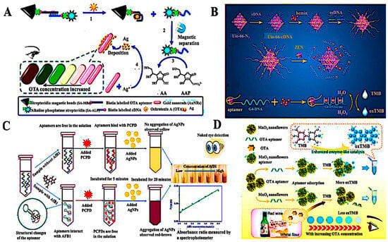 Aptamer-based biosensing strategies for mycotoxin detection. (A) Magnetic bead-assisted aptasensor with silver deposition for OTA detection; reused with permission from []. (B) DNAzyme-coupled aptamer biosensor for zearalenone; reused with permission from []. (C) Aptamer-based aggregation assay for aflatoxin B1 with AgNPs; reused with permission from []; (D) MnO2 nanoflower-assisted aptamer biosensor for OTA detection in wine and wheat flour, with permission from [].