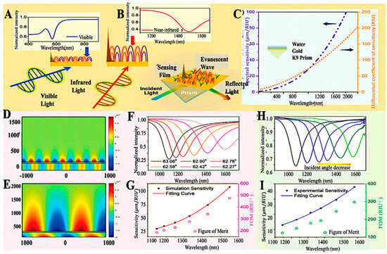 Schematic and spectral simulations of NIR optical sensing. (A) Absorbance of visible light; (B) absorbance of near-infrared light; (C) spectral sensitivity and differential coefficient of sensitivity across wavelengths; (D,E) field distribution maps; (F,H) normalized intensity at varying incident angles; (G,I) simulated and experimental sensitivity curves with figures of merit. These illustrate the wavelength dependence and high sensitivity potential of NIR spectroscopy for biosensing applications. Reused with permission from [].