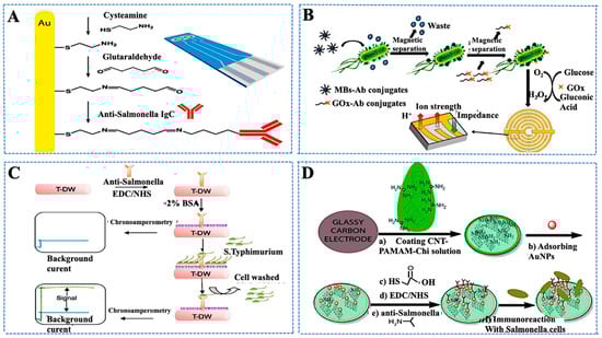 Hybrid biosensors for pathogen detection. (A) Electrode functionalization with anti-Salmonella antibodies, reused with permission from []. (B) Magnetic bead-assisted separation with impedance sensing, reused with permission from []. (C) Chronoamperometric detection of S. Typhimurium, ref. [], and (D) nanomaterial-modified glassy carbon electrodes for enhanced Salmonella recognition, with permission from [].