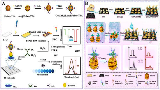 Recent studies highlight these challenges and solutions: Shoaib et al. emphasized aptamer instability in food biosensors []; Zhu et al. demonstrated matrix fouling issues in mycotoxin detection []; and Qu et al. reviewed nanotechnology-driven enzyme biosensors as a path to enhanced stability []. Similarly, Xu et al. developed an impedimetric aptasensor based on highly porous gold that addressed biofouling and stability concerns in complex food matrices [], while Zhang et al. reported optical drift in heavy metal detection sensors []. More recently, Chen et al. advanced portable NIR-fluorescent sensing systems that incorporated recalibration protocols to counteract drift []. Additional contributions reinforce these findings; Hassan et al. employed SERS-based nanostructures for rapid contaminant detection, showing that surface modifications can mitigate fouling []. Lin et al. demonstrated how multi-sensor arrays enhance robustness in rice freshness monitoring, reducing the impact of drift []. Studies such as Golly et al. on grape preservation and Anandkumar et al. on toxic element accumulation further underscore the importance of stability and recalibration in food safety monitoring [,]. In Figure 11, multifunctional biosensors integrating PEC, SERS, and colorimetric modalities provide redundant signal channels that cross-validate measurements. This design minimizes the impact of biofouling or drift in any single modality, enhancing stability and extending operational shelf-life in real-world food monitoring applications. Figure 11A presents a FePor-TPA-based dual-mode PEC–colorimetric biosensor integrating glucose oxidase (GOx) and AuNPs for Staphylococcus aureus detection. This system not only identifies microbial contamination but also correlates enzymatic oxidation by-products (e.g., H2O2) with freshness indicators such as oxidative spoilage. The visible color change and photocurrent variation allow rapid on-site estimation of microbial load, a critical determinant of food shelf life [] and Figure 11B illustrates a CM–MXene hybrid PEC–SERS platform that detects heavy metal ions (Pb2+) and pathogens through DNAzyme-assisted signal generation. The “on–off” PEC and SERS responses provide dual confirmation of spoilage or contamination events, offering a robust strategy for predicting the remaining shelf life of stored products by continuously sensing biochemical and environmental changes []. Collectively, these advances highlight that while sensor drift and fouling remain critical challenges, integrated nanotechnology and calibration strategies are paving the way toward more durable and reliable systems.